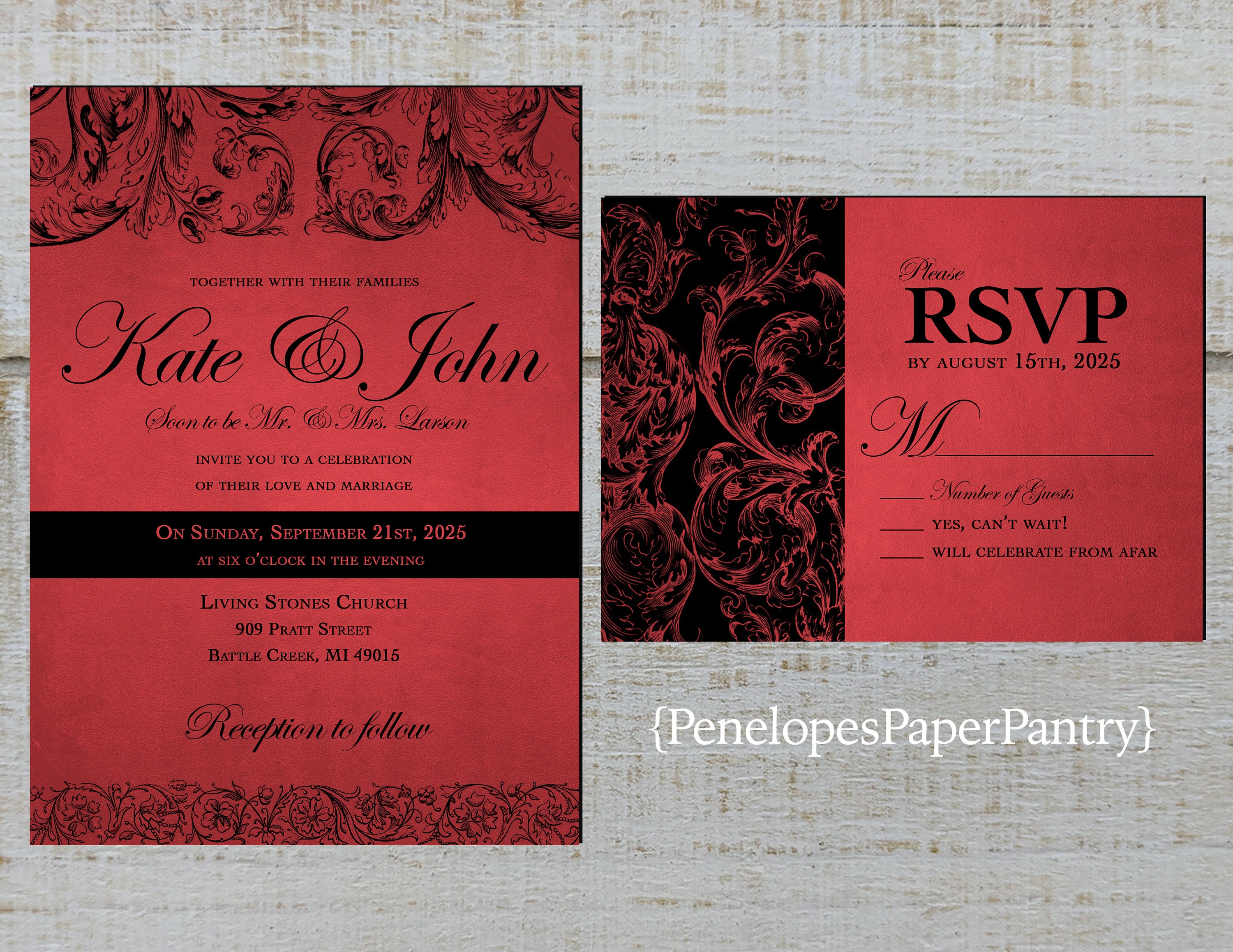 Elegant Red And Black Wedding Invitationssophisticated Etsy India